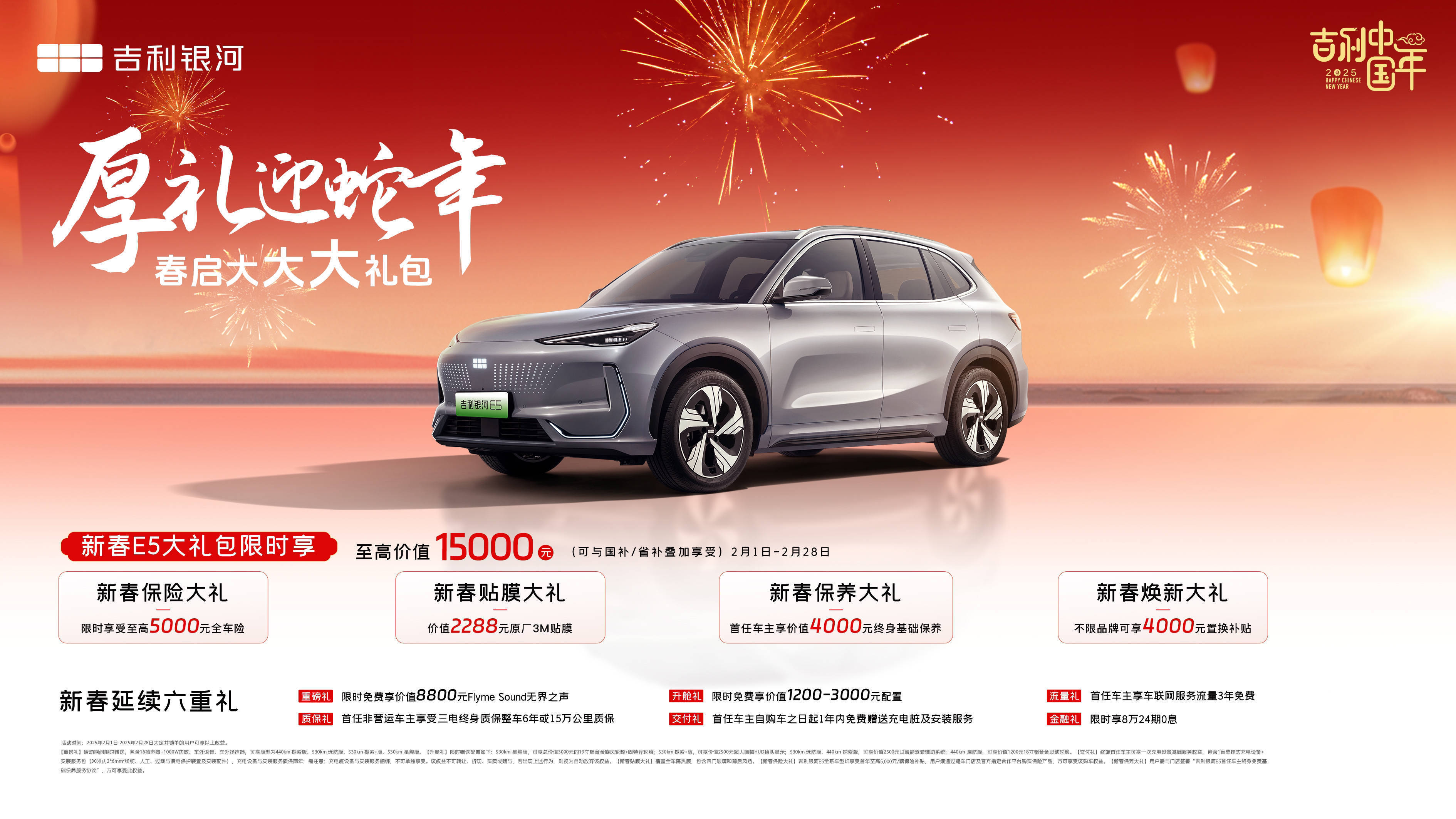 家人们,新年新气象,买车也有新福利啦!吉利银河 E5 为了给大伙送上新春惊喜,直接推出了限时新春大礼包,这波操作可太给力了,坤哥我必须第一时间给大家安排上详细解读。